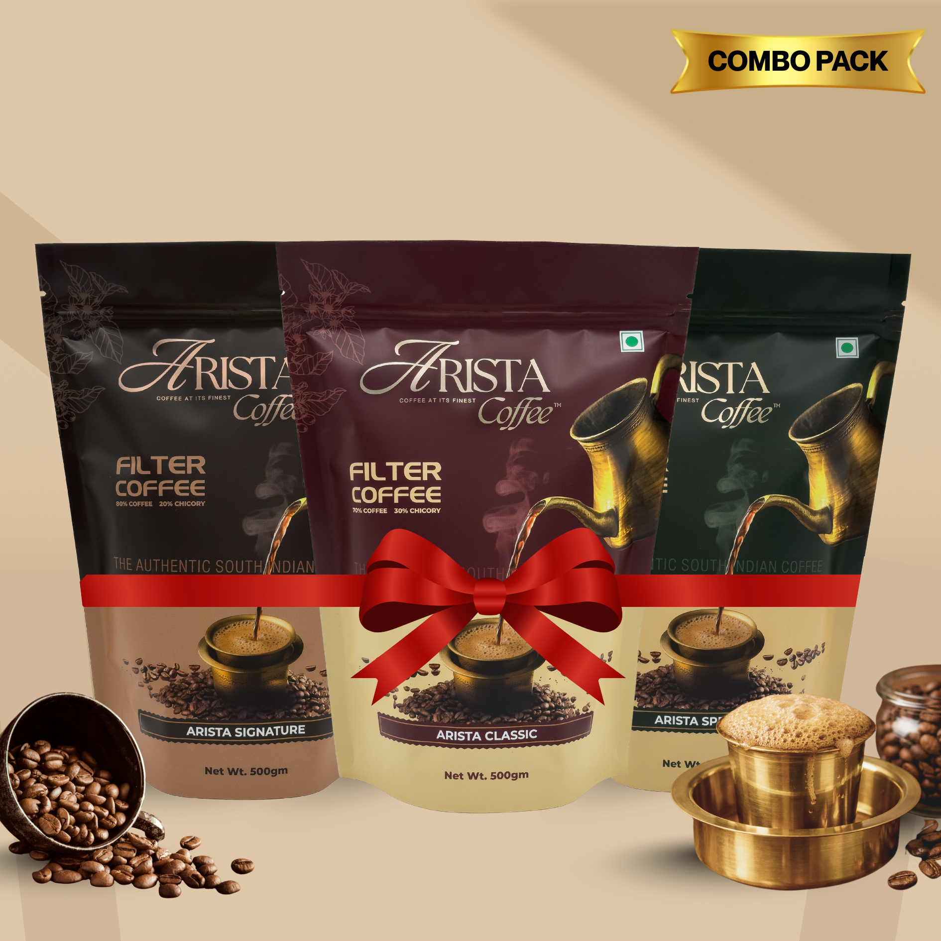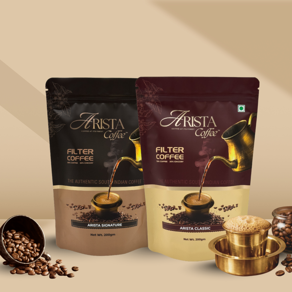 The Arista Filter Coffee Combo brings together all three of our authentic filter coffee blends in generous 500g packs. This combo includes Arista Special made with 100% pure coffee, Arista Signature with an 80:20 coffee-chicory balance, and Arista Classic with a bold 70:30 blend. Perfect for regular coffee drinkers and households, this set offers versatility, consistency, and authentic South Indian taste across every cup. Price valid only on combo pack & not on individual product selection. [ NOTE: Dabara set not included]